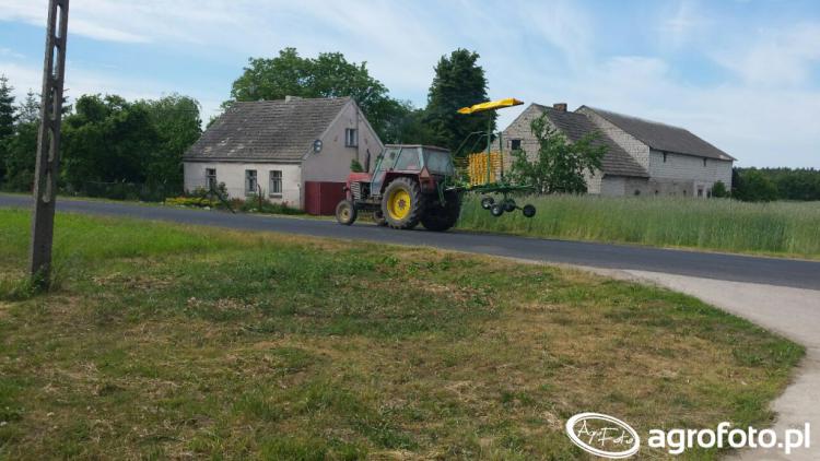 Ursus C-385 pracuje jako uniwersalny ciągnik rolniczy średniej mocy, współpracując z maszyną do zgrabiania zielonki, co dobrze wykorzystuje jego silnik S-4003 o mocy około 76 KM, czterocylindrowy, o pojemności 4,0 l. Mechaniczna skrzynia biegów 16/8 z reduktorem zapewnia odpowiedni dobór przełożeń do pracy na uwrociach oraz spokojnej jazdy roboczej podczas zgrabiania. Masa własna ciągnika na poziomie około 4,0 t poprawia trakcję i stabilność zestawu na nierównym polu, a tylny trzypunktowy układ zawieszenia o udźwigu około 3,5 t umożliwia współpracę zarówno z lekkimi zgrabiarkami, jak i cięższymi maszynami uprawowymi. Model C-385 był produkowany w latach 1971–1984, a przybliżone ceny rynkowe używanych egzemplarzy w Polsce mieszczą się obecnie w zakresie od 25 000 do 50 000 zł, zależnie od stanu technicznego i wyposażenia.