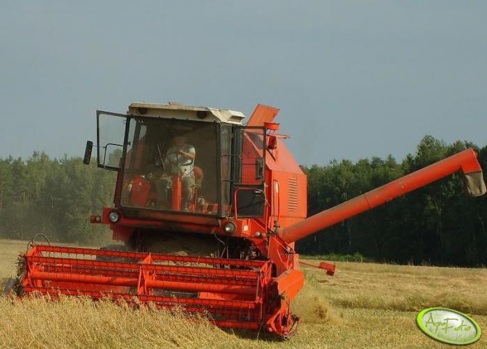 Kombajn Bizon Rekord Z058 podczas koszenia zboża na polu. Maszyna charakteryzuje się klasycznym, czerwonym kolorem i wyposażona jest w heder z motowidłami, co potwierdza jej przeznaczenie do żniw zbożowych. Bizon Rekord Z058 jest napędzany sześciocylindrowym silnikiem wysokoprężnym o mocy 100 KM, co umożliwia efektywną pracę w różnorodnych warunkach polowych. Zbiornik na ziarno o pojemności 3000 litrów pozwala na dłuższą pracę bez potrzeby częstego opróżniania. Ten model kombajnu wyposażony jest w konwencjonalny system omłotu oraz szerokość hedera wynoszącą 4,2 metra, co pozwala na pokrycie dużej powierzchni w krótkim czasie. Warunki otoczenia wskazują na typowe pole z drzewami w tle, co jest częstym krajobrazem podczas sezonu żniwnego.