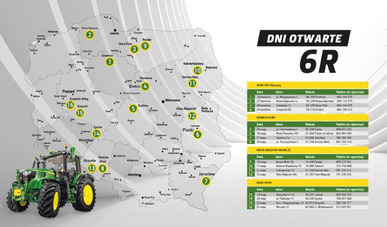 ni Otwarte John Deere odbywają się w aż 16 lokalizacjach w całej Polsce i będą swojego rodzaju premierą ciągnika 6R w Polsce. Wydarzenie to jest okazją dla szerokiej publiczności, żeby zobaczyć z bliska nową serię, lepiej poznać możliwości maszyn John Deere’a i porozmawiać z ekspertami.
