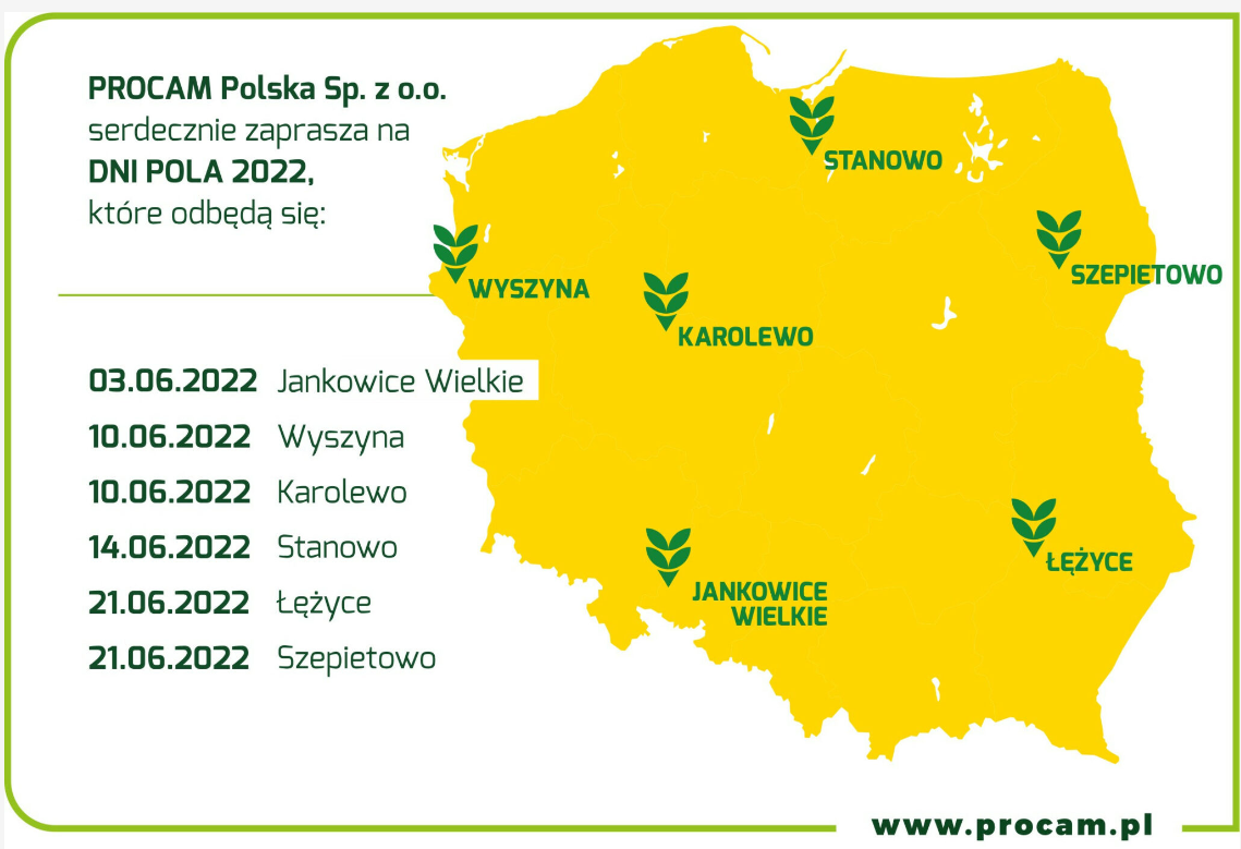 Zapraszamy do zapoznania się z terminami Dni Pola PROCAM 2022 a także do aktywnego udziału w spotkaniach, więcej informacji znajdą Państwo na www.procam.pl.