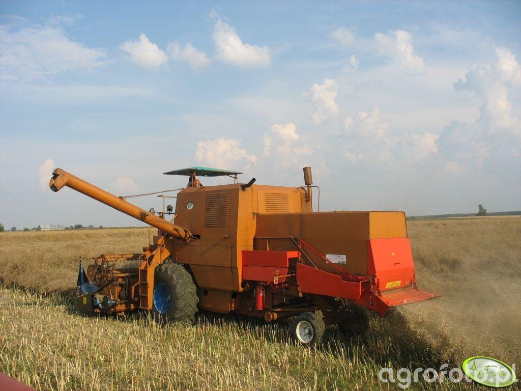 Kombajn Bizon Z056/3 podczas koszenia zboża na polu. Ta maszyna, znana w polskim rolnictwie, jest napędzana silnikiem o mocy około 100 KM, co pozwala na efektywne wykorzystanie hedera z motowidłami do zbioru zbóż. Bizon Z056/3 charakteryzuje się pojemnością zbiornika na ziarno wynoszącą około 3000 litrów, co umożliwia dłuższą pracę bez konieczności częstego opróżniania. Kombajn został zaprojektowany do pracy w różnych warunkach polowych, a jego solidna i prosta konstrukcja sprawia, że jest łatwy w konserwacji. Na zdjęciu widzimy go w akcji, zbierającego zboże na rozległym polu, co podkreśla jego zdolność do sprawnego i skutecznego prowadzenia żniw.