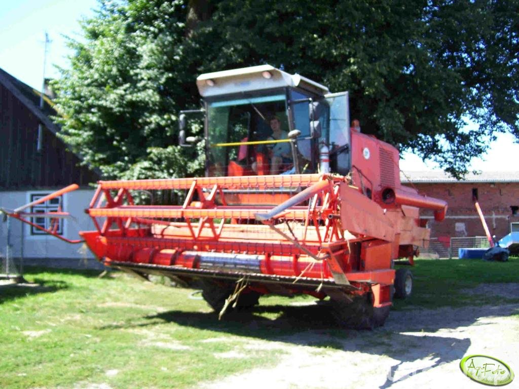 Kombajn Bizon Z056/Super widoczny na zdjęciu to klasyczna maszyna wykorzystywana w polskich gospodarstwach rolnych. Maszyna jest wyposażona w heder z motowidłami, co wskazuje na jej przeznaczenie do koszenia zbóż. Bizon Z056/Super ma silnik o mocy 100 KM, co pozwala mu na efektywne funkcjonowanie podczas długotrwałych prac polowych. Pojemność zbiornika na ziarno wynosi 3000 l, co umożliwia pracę bez częstego przerywania na rozładunek, a bęben młócący z siedmioma listwami zapewnia skuteczny omłot. Na zdjęciu kombajn znajduje się na terenie gospodarstwa, gotowy do prac żniwnych w sezonie.