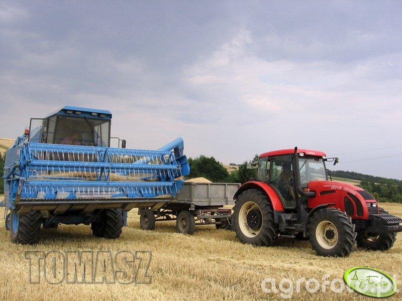 Na zdjęciu widoczny jest kombajn zbożowy Bizon Rekord Z058 podczas prac żniwnych na polu pszenicy. Maszyna, charakterystyczna dzięki swojej niebieskiej kolorystyce, jest wyposażona w heder z motowidłami, co wskazuje na koszenie zbóż. Kombajn napędzany jest silnikiem o mocy około 150 KM, co pozwala na efektywne prowadzenie żniw na średnich i dużych polach. Zbiornik na ziarno o pojemności 3 600 litrów umożliwia dłuższą pracę bez konieczności częstego wyładunku. Moment przedstawiony na zdjęciu ukazuje wysyp ziarna na przyczepę rolniczą, co jest kluczowym elementem płynnego przebiegu żniw. Kombajn pracuje na złocistym ściernisku, co podkreśla realistyczne warunki pracy w sezonie żniwnym.