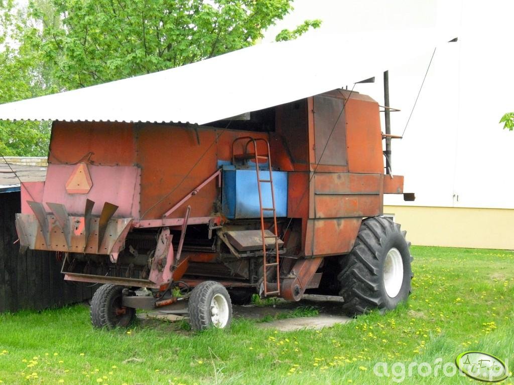 Kombajn Bizon Z056 podczas postoju na placu gospodarstwa. Charakterystyczna konstrukcja maszyny, z czerwonymi panelami i żółtymi kołami, wskazuje na popularny w Polsce model Z056, przeznaczony do zbioru zbóż. Jego silnik SW400 o mocy 100 KM oraz tradycyjny bębnowy system omłotu umożliwiają wydajną pracę na polach z różnorodnymi zbożami. Maszyna wyposażona w heder z motowidłami doskonale sprawdza się w koszeniu pszenicy czy jęczmienia. Zbiornik o pojemności 2 550 litrów pozwala na dłuższą pracę bez przerwy na rozładunek. Brazowy dach osłaniający kombajn świadczy o jego przygotowaniu do dłuższego postoju lub konserwacji.