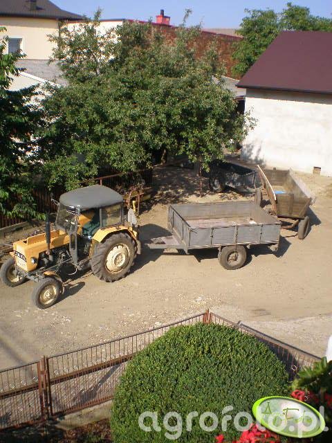 Ursus C-335 podczas typowych prac w gospodarstwie współpracuje z przyczepą rolniczą pełniącą funkcję prostego rozrzutnika obornika, wykorzystując tylni TUZ i zaczep polowy do transportu i rozładunku nawozu na placu. Ten ciągnik, produkowany w Polsce w latach około 1968–1983 jako rozwinięcie serii C-325/C-330, wyposażony jest w trzycylindrowy silnik wysokoprężny Ursus/Zetor o pojemności ok. 2,5 l i mocy około 35 KM, co zapewnia wystarczający moment obrotowy do pracy z lekkim rozrzutnikiem i przyczepą jednoosiową. Mechaniczna skrzynia biegów o 6 przełożeniach do przodu i 2 wstecz pozwala dobrać odpowiednią prędkość do manewrowania na podwórzu gospodarskim, a masa własna rzędu 1900–2000 kg gwarantuje stabilność zestawu podczas podczepiania i manewrów z ładunkiem. Udźwig tylnego TUZ wynoszący około 800–900 kg umożliwia obsługę prostych maszyn towarzyszących, a przybliżone ceny używanych egzemplarzy Ursusa C-335 na rynku polskim mieszczą się zazwyczaj w przedziale 18–30 tys. zł w zależności od stanu technicznego i wyposażenia.