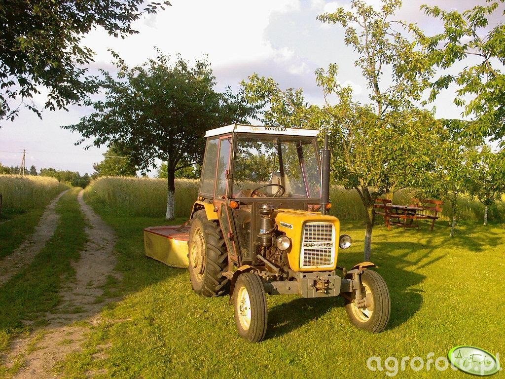 Ursus C-330 pracuje z kosiarką dyskową podczas koszenia łąki, wykorzystując prostą, ale bardzo trwałą konstrukcję charakterystyczną dla tej serii. Ciągnik napędzany jest czterocylindrowym silnikiem S-312C o pojemności 1960 cm³ i mocy około 30 KM, co w zupełności wystarcza do współpracy z lekkimi maszynami zielonkowymi. Mechaniczna skrzynia biegów 6 2 pozwala dobrać odpowiednią prędkość roboczą do gęstości runi i szerokości roboczej kosiarki, a hydrauliczny podnośnik z udźwigiem około 1200 kg stabilnie utrzymuje maszynę zawieszaną. Masa własna około 1900 kg zapewnia wystarczającą trakcję na wilgotnym podłożu łąkowym. Model Ursus C-330 był produkowany w latach 1967–1987 i do dziś jest popularnym ciągnikiem pomocniczym, a przybliżone ceny zadbanych egzemplarzy na rynku wtórnym w Polsce mieszczą się zazwyczaj w przedziale 15–30 tys. zł.