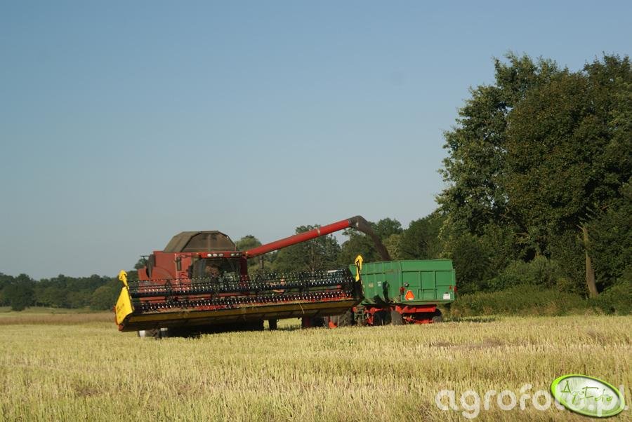 Kombajn Case 8010 podczas zbioru zboża na polu, imponująco prezentuje swoje możliwości. Wyposażony w silnik o mocy 450 KM, zapewnia wydajność przy dużym obciążeniu. Pojemność zbiornika na ziarno wynosząca 12 334 litry umożliwia długie przejazdy bez konieczności przerw na rozładunek. Rotorowy system omłotu, typowy dla modeli Axial-Flow, gwarantuje wysoką przepustowość i doskonałe oddzielenie ziaren od słomy. W tym ujęciu kombajn pracuje z szerokim, zbożowym hederem, co pozwala na szybkie i efektywne prowadzenie zbiorów na dużej powierzchni. Dzięki zaawansowanej technologii, Case 8010 efektywnie zwiększa efektywność pracy podczas intensywnego sezonu żniw.