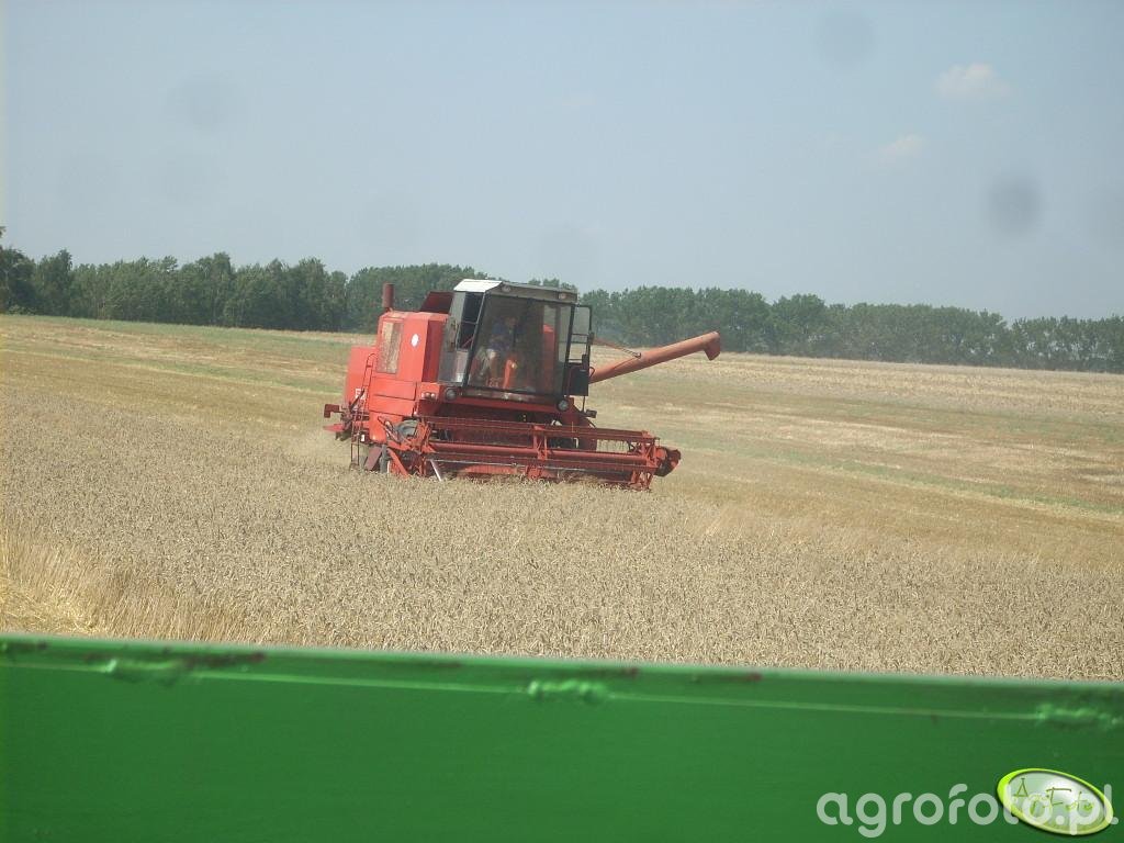 Kombajn Bizon Z056 podczas żniw na polu zboża. Maszyna, rozpoznawalna dzięki charakterystycznej czerwonej kolorystyce i kwadratowej kabinie, jest wyposażona w heder z motowidłami, co wskazuje na koszenie zbóż. Bizon Z056 napędzany jest silnikiem wysokoprężnym SW680 o mocy 100 KM, który charakteryzuje się niezawodnością w ciężkich warunkach polowych. Zbiornik ziarna o pojemności 3240 litrów pozwala na długą pracę bez potrzeby częstego opróżniania, a system omłotu typu klasycznego zapewnia efektywne oddzielanie ziarna od kłosów. Maszyna znajduje się na polu, gdzie widać zieloną uprawę zboża przed zbiorem, a w tle widoczna jest linia drzew, tworząca naturalne ograniczenie terenu uprawnego.