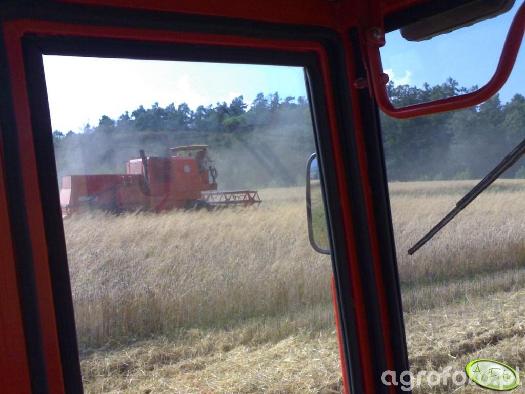 Kombajn Bizon Z056 Super podczas żniw zboża na polu. Maszyna jest wyposażona w heder z motowidłami, pozwalającą na efektywne koszenie zbóż. Napędzana silnikiem o mocy około 100 KM, kombajn operuje systemem omłotu bębnowym, który zapewnia efektywne oddzielanie ziarna od słomy. Zbiornik ziarna kombajnu ma pojemność około 2540 litrów, co umożliwia długą pracę bez częstego przerywania na wyładunek. Widoczny w tle ściernisko oraz pola sugerują typowe, sezonowe prace żniwne. Czerwona konstrukcja maszyny wyróżnia się na tle pola, a obecność drzew w oddali świadczy o pracy w otwartym terenie rolniczym.