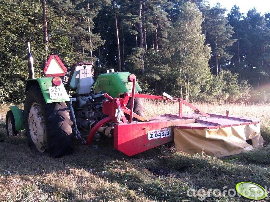 Ursus C-328 współpracuje z kosiarką bębnową Agromet Z-042/4 podczas koszenia traw na łące, wykorzystując prostą, ale wystarczająco mocną konstrukcję do lekkich prac zielonkowych. Ciągnik tej serii był produkowany w latach 1963–1968 i wyposażony jest w dwucylindrowy silnik S-312C o pojemności 1960 cm³, rozwijający około 28 KM, co dobrze koresponduje z zapotrzebowaniem mocy niewielkiej kosiarki rotacyjnej zawieszanej na tylnym TUZ. Mechaniczna skrzynia biegów 6 2 umożliwia dobór odpowiedniej prędkości roboczej przy pracy w gęstej runi łąkowej, a masa własna rzędu 1500–1600 kg zapewnia wystarczającą stabilność zestawu. Udźwig tylnego podnośnika na poziomie około 800–900 kg pozwala bezpiecznie obsługiwać kosiarkę Z-042/4, typowo o szerokości roboczej 1,35–1,65 m. Na rynku wtórnym w Polsce Ursus C-328 w sprawnym stanie technicznym osiąga przybliżone ceny w zakresie 12–22 tys. zł, zależnie od kompletności, oryginalności podzespołów i stopnia zużycia.