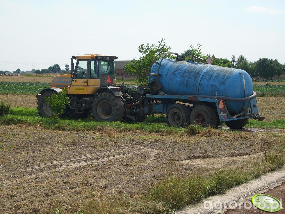 JCB Fastrac 185-65, widoczny na zdjęciu, to wszechstronny ciągnik rolniczy charakteryzujący się unikalnymi parametrami technicznymi. Napędzany silnikiem Cummins o mocy 185 KM, posiada sześciocylindrową jednostkę napędową o pojemności 8.3 litra. Wyposażony w pełną zawieszoną i bezstopniową skrzynię biegów, JCB Fastrac 185-65 doskonale nadaje się do różnorodnych prac polowych. Na zdjęciu widać, jak ciągnik współpracuje z wozem asenizacyjnym, co pozwala na efektywną i precyzyjną dystrybucję płynnych nawozów na dużym obszarze. Dzięki imponującej mocy i wydajności, JCB Fastrac 185-65 zapewnia niezawodność i efektywność pracy na polu.