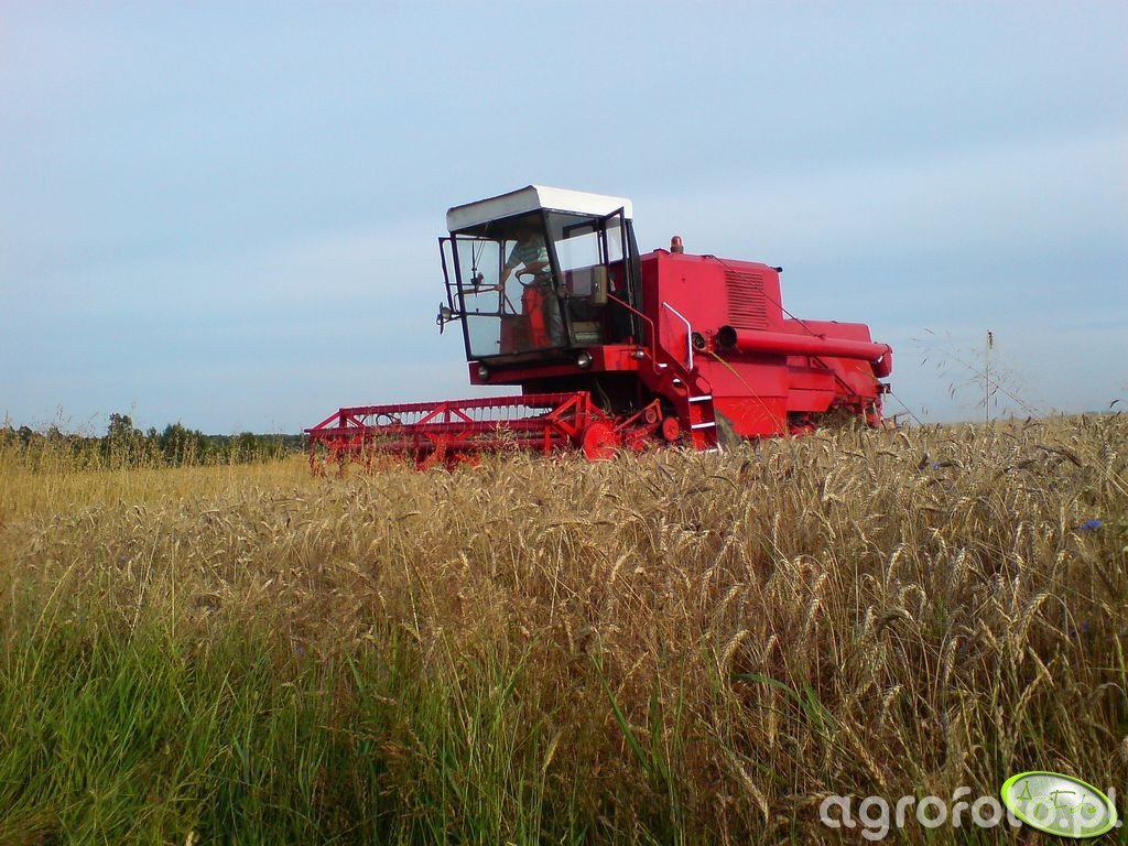 Kombajn Bizon Z056 Super podczas koszenia zboża na polu. Ten charakterystyczny czerwony kombajn wyposażony jest w heder z motowidłami, co wskazuje na typową pracę żniwną. Bizon Z056 Super jest napędzany sześciocylindrowym silnikiem o mocy 100 KM, co umożliwia stabilną i wydajną pracę w różnorodnych warunkach polowych. Maszyna korzysta z bębnowego systemu omłotu, który pozwala na efektywne oddzielanie ziarna, a jego zbiornik ziarna ma pojemność 3000 litrów. Widoczny na zdjęciu heder o szerokości 4,2 metra pozwala na szybkie przycinanie dużych obszarów pól, co zwiększa efektywność pracy podczas intensywnych sezonów żniwnych. Kombajn, sfotografowany na naturalnym tle, podkreśla swój rolniczy charakter, działając wśród złocistych łanów dojrzałego zboża.