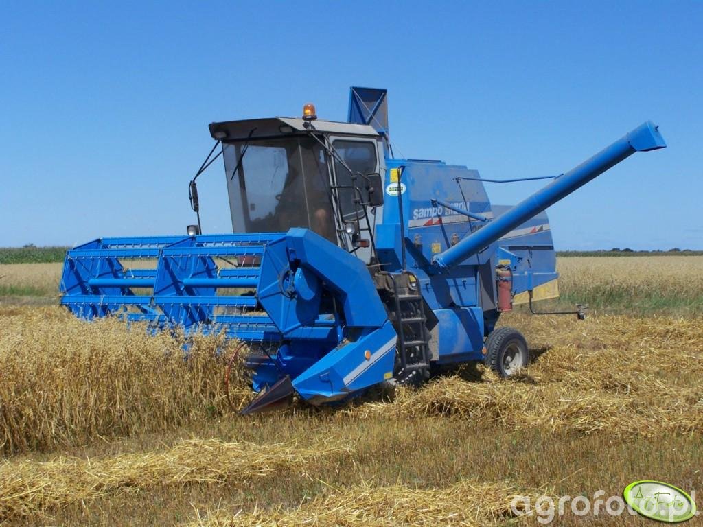 Kombajn Bizon Sampo 2020 podczas żniw zbóż na polu. Maszyna jest wyposażona w heder z motowidłami, co wskazuje na koszenie różnego rodzaju zbóż. Bizon Sampo 2020 charakteryzuje się kompaktową konstrukcją, zapewniającą zwrotność i efektywność na mniejszych polach. Kombajn jest wyposażony w sześciocylindrowy silnik diesla, który generuje optymalną moc do pracy polowej. Zintegrowany zbiornik o pojemności około 3000-4000 litrów pozwala na dłuższą pracę bez konieczności częstego postojów na wyładunek ziarna. Całość jest utrzymana w charakterystycznej, niebieskiej kolorystyce z wyraźnymi oznaczeniami marki. Praca na otwartym polu, w jasnym świetle słonecznym, podkreśla skuteczność i niezawodność modelu w typowych warunkach rolniczych.