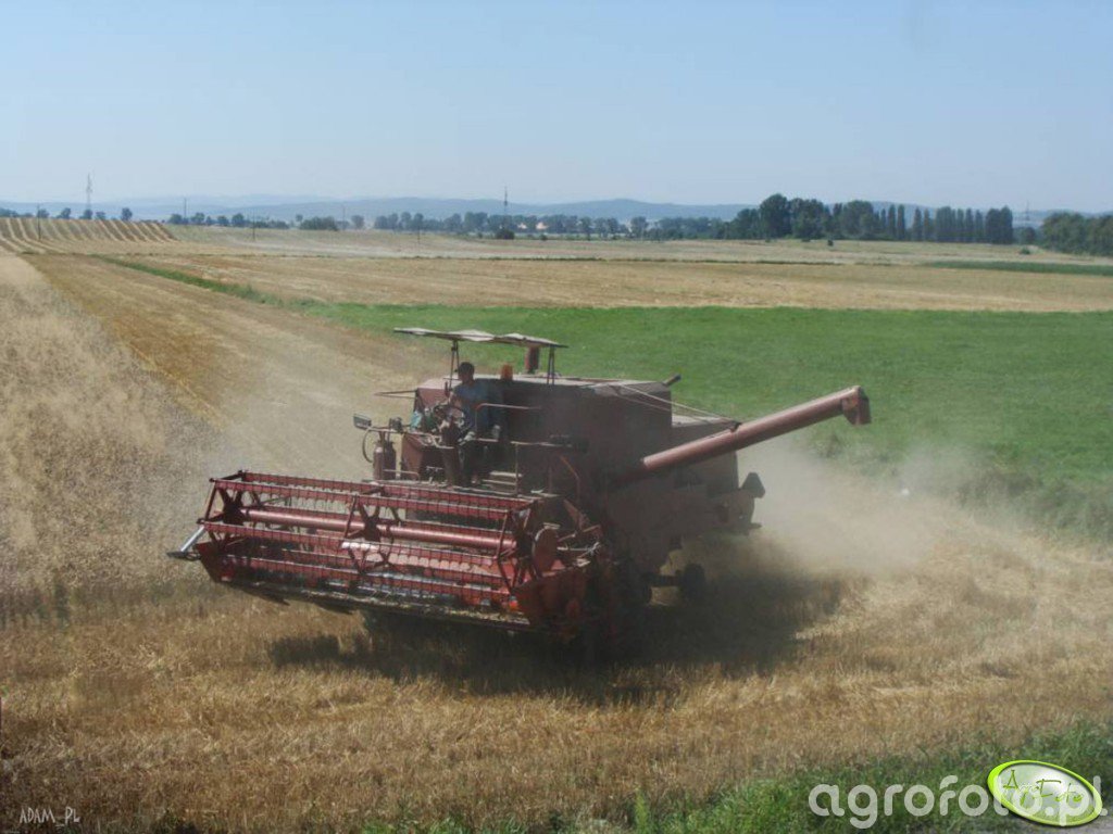 Kombajn Bizon Z056 podczas koszenia zbóż na polu, w pełnym słońcu żniwnego dnia. Model ten wyróżnia się legendarną niezawodnością polskich maszyn rolniczych. Napędzany silnikiem SW400 o mocy 100 KM, Bizon Z056 oferuje wydajność odpowiednią do średniej wielkości gospodarstw. Charakterystyczny czerwony kolor oraz heder z motowidłami o szerokości 4,2 metra pozwalają na efektywne zbieranie zbóż. Zbiornik ziarna o pojemności 3 000 litrów zapewnia możliwość dłuższej pracy bez potrzeby częstego rozładunku, co jest istotną cechą podczas intensywnych prac polowych. Opatrzone osłonami i prostą konstrukcją, Bizon Z056 prezentuje klasyczne podejście do mechanizacji rolnictwa, łącząc funkcjonalność z łatwością obsługi, idealnie wpisując się w krajobraz rolniczy.