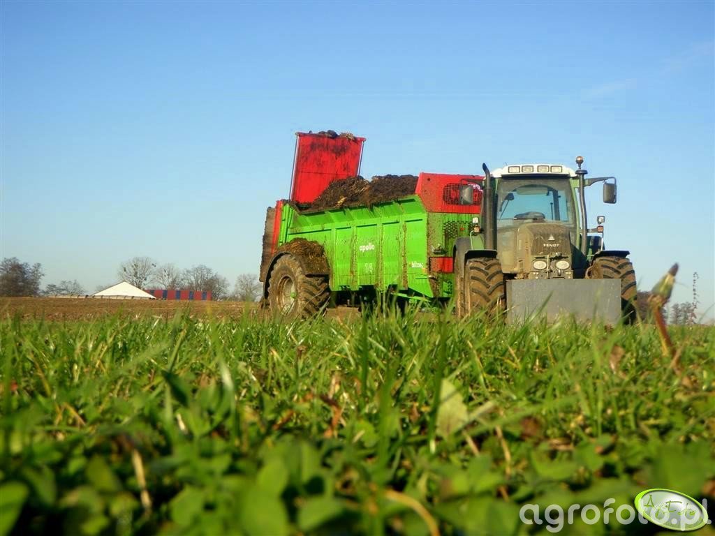 Ciągnik Fendt 312 Vario pracuje na polu, efektywnie rozrzucając obornik za pomocą rozrzutnika Apollo 14. Wyposażony w innowacyjną skrzynię biegów Vario, umożliwiającą płynną zmianę prędkości, Fendt 312 Vario czerpie moc z 4-cylindrowego silnika o pojemności skokowej 4.4 litra, co pozwala na maksymalną wydajność podczas pracy z ciężkim osprzętem. Moc 125 KM umożliwia dynamiczną i niezawodną współpracę z rozrzutnikiem, zapewniając równomierne pokrycie pola nawozem, co znacząco poprawia jakość gleby. Taki zestaw, doskonale dobrany pod kątem specyfikacji technicznej, przekształca ciężkie zadania rolnicze w wydajne i precyzyjne działania.