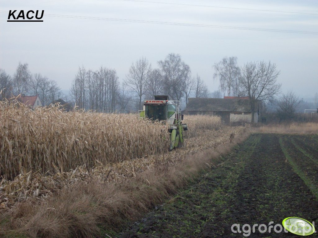 Kombajn Claas Dominator 78 podczas zbioru kukurydzy na polu. Maszyna wyposażona jest w heder z dziobami, co umożliwia efektywne zbieranie kolb kukurydzy. Claas Dominator 78 jest napędzany silnikiem o mocy około 120 KM, co zapewnia wystarczającą siłę do zasilania systemu omłotu, wykorzystującego tradycyjny bęben. Pojemność zbiornika wynosząca 4200 litrów pozwala na dłuższą pracę bez częstego wyładunku. W tle widoczne są zabudowania wiejskie oraz drzewa bez liści, co sugeruje realizację zbiorów w późnym okresie sezonu jesiennego. Kombajn porusza się po szerokich ścieżkach międzyrzędowych, co ułatwia manewrowanie w polowych warunkach.