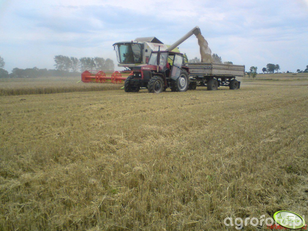 Kombajn Claas Tucano 320 podczas rozładunku zboża na polu. Maszyna jest napędzana silnikiem Mercedes-Benz OM 936, który generuje moc około 245 KM, pozwalając na efektywne działanie. Wyposażony w system omłotu APS, wydatnie zwiększa przepustowość zbiorów, co jest kluczowe podczas intensywnych prac żniwnych. Zbiornik o pojemności 9000 litrów umożliwia dłuższą pracę bez przerw na rozładunek. Na zdjęciu widoczny jest moment wysypywania zboża do przyczepy, co jest integralną częścią procesu żniwnego. Szeroki heder z motowidłami pozwala na efektywne koszenie zbóż, co w połączeniu z innowacyjnymi rozwiązaniami technicznymi Claas, czyni z Tucano 320 niezawodnego partnera w rolnictwie.