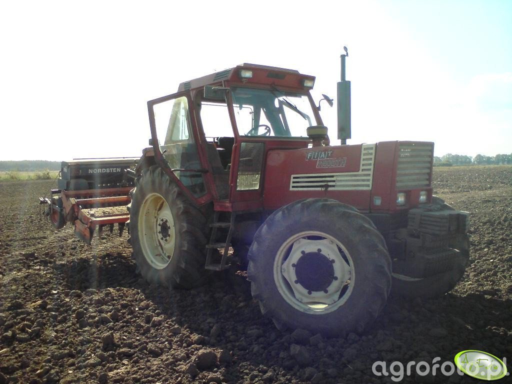 Na zdjęciu znajduje się ciągnik Fiat 1180DTH, który jest głównym przedmiotem uwagi. Model ten charakteryzuje się mocą znamionową wynoszącą 117 KM, co czyni go efektywnym narzędziem w gospodarstwie rolnym. Ciągnik napędzany jest silnikiem IVECO o pojemności 5.4 litra, posiadającym 6 cylindrów, co zapewnia odpowiednią siłę podczas pracy w polu. Fiat 1180DTH wyposażony jest w mechaniczno-hydrostatyczną skrzynię biegów z 16 przełożeniami do przodu, co umożliwia płynne dostosowywanie prędkości do warunków pracy. Na zdjęciu ciągnik współpracuje z agregatem uprawowo-siewnym, w skład którego wchodzą maszyny Maschio i Nordsten. Taka konfiguracja sprzętu pozwala na jednoczesne przeprowadzanie uprawy i siewu, co znacznie usprawnia procesy polowe i zwiększa ich efektywność. Całość operuje na zaoranym polu, co podkreśla kontekst praktycznego wykorzystania tego zestawu maszyn w codziennej pracy rolnika.