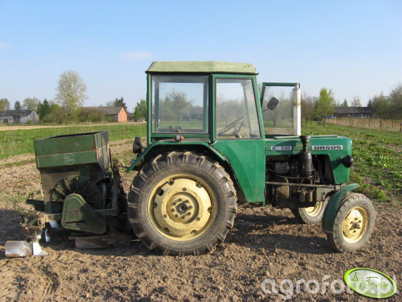 Ursus C-330 współpracuje z zawieszaną sadzarką do ziemniaków na polu podczas wiosennych prac uprawowo-siewnych, wykorzystując swoją prostą, ale wydajną konstrukcję małego ciągnika. Model C-330 był produkowany w latach 1967–1987 i napędzany jest dwucylindrowym silnikiem wysokoprężnym S-312C o pojemności 1960 cm³ i mocy około 30 KM, co w zupełności wystarcza do obsługi lekkich maszyn zawieszanych, takich jak sadzarka dwurzędowa. Mechaniczna skrzynia biegów 6 2 umożliwia dobranie odpowiednio wolnego przełożenia roboczego, istotnego przy równomiernym odkładaniu sadzeniaków. Masa własna około 1900 kg oraz udźwig tylnego TUZ rzędu 800–1200 kg zapewniają stabilną współpracę z maszyną towarzyszącą, nawet na luźniejszej, świeżo uprawionej glebie. Na rynku wtórnym w Polsce przybliżone ceny sprawnych Ursusów C-330 mieszczą się zazwyczaj w przedziale 15–30 tys. zł w zależności od stanu technicznego i wyposażenia.