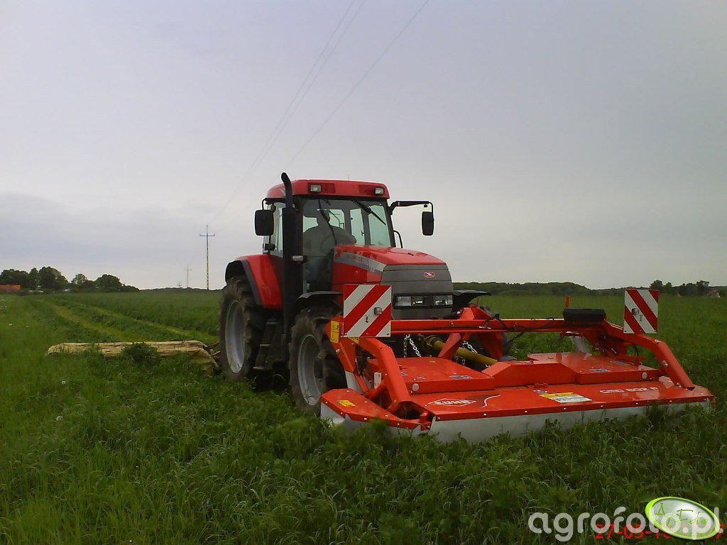 McCormick MTX 135 kosiarki Kategoria: McCormick Tagi z systemu: McCormick, MTX 135, Kuhn, kosiarka, rolnictwo, sianokosy, ciągnik, maszyny rolnicze Tagi wizualne: czerwony ciągnik, kosiarka czołowa, zielone pole, zachmurzone niebo, słupy wysokiego napięcia Patrzymy na McCormick'a MTX 135, prawdziwego konia pociągowego z początków XXI wieku (produkowany w latach 2002-2007), który nawet dziś nie boi się ciężkiej roboty w polu. Pod tą czerwoną maską drzemie pancerne serce – sześciocylindrowy silnik Perkinsa o pojemności 6 litrów, generujący solidne 135 KM, co pozwala mu sprawnie prowadzić tak wymagające zestawy. Widać, że maszyna jest zadbana, opony w doskonałym stanie, a blacharka lśni, co świadczy o sumiennym właścicielu. Przedni TUZ bez problemu radzi sobie z czołową kosiarką Kuhn GMD 802 F, która precyzyjnie układa zielonkę w rzędy, szykując pole na szybki zbiór. To połączenie to gwarancja wydajności i niezawodności. Nie dziwi więc, że ten model McCormick'a wciąż "trzyma cenę" na rynku wtórnym – dziś za dobrze utrzymany egzemplarz trzeba wyłożyć od 80 do 130 tysięcy złotych, co jest najlepszym dowodem na jego trwałość i bezawaryjność. Taka robota w polu to czysta przyjemność!