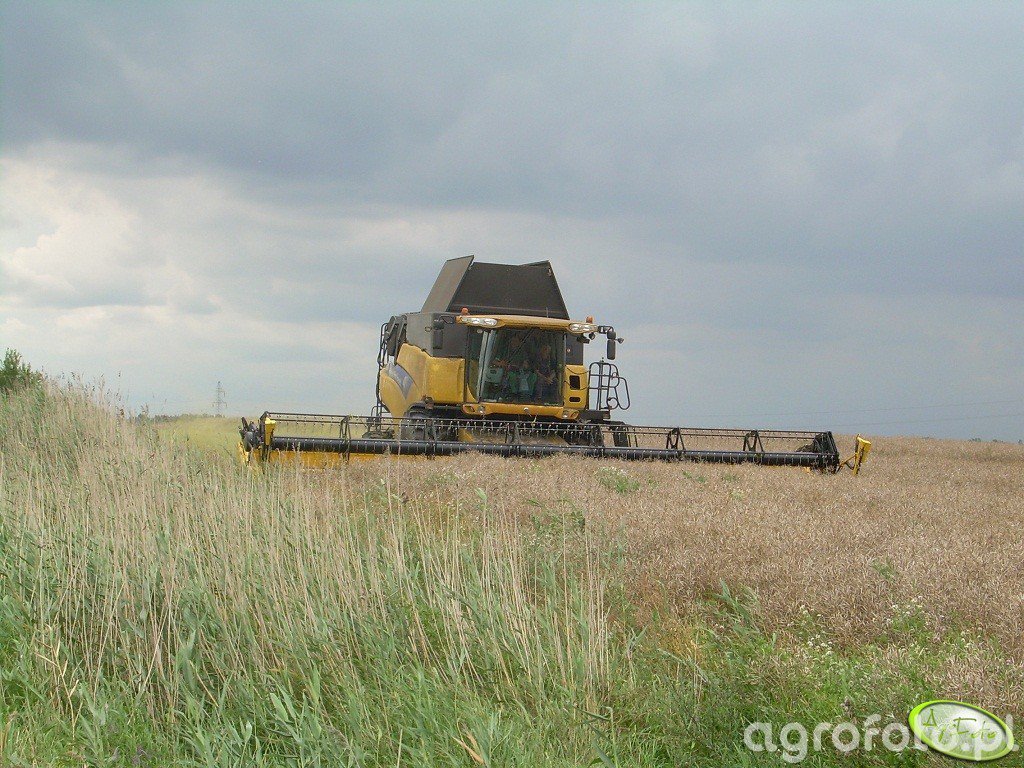 Kombajn New Holland CR 9090 Elevation podczas żniw pszenicy. Maszyna jest wyposażona w heder z motowidłami, co umożliwia efektywne koszenie zboża. Napędzana zaawansowanym silnikiem o mocy przekraczającej 500 KM, doskonale radzi sobie z intensywną pracą na polu. Cechuje się pojemnością zbiornika wynoszącą 12 500 litrów, co pozwala na dłuższą pracę bez przerw na opróżnianie. System omłotu Twin Rotor zapewnia wysoką przepustowość oraz jakość ziarna. Zdjęcie wykonano w trakcie pracy na rozległym polu zbożowym, co podkreśla wszechstronność i zaawansowanie technologiczne tego modelu w trudnych warunkach polowych.