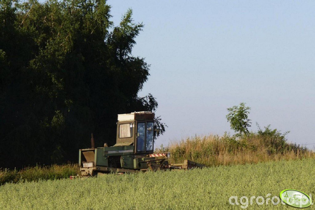 Kosiarka bębnowa Fortschritt E-303 podczas koszenia traw na łące. Maszyna charakteryzuje się wytrzymałą konstrukcją i zielonym kolorem, typowym dla serii Fortschritt. Model E-303 jest wyposażony w czterocylindrowy silnik o mocy około 100 KM, co zapewnia wystarczającą siłę do efektywnego napędzania zespołu tnącego. Kosiarka posiada szeroki heder bębnowy, który umożliwia szybkie i dokładne koszenie trawy na dużych obszarach. Na zdjęciu maszyna pracuje w otoczeniu zieleni, co odzwierciedla jej typowe zastosowanie w rolnictwie, gdzie wykorzystywana jest do przycinania traw i roślinności zielonej.