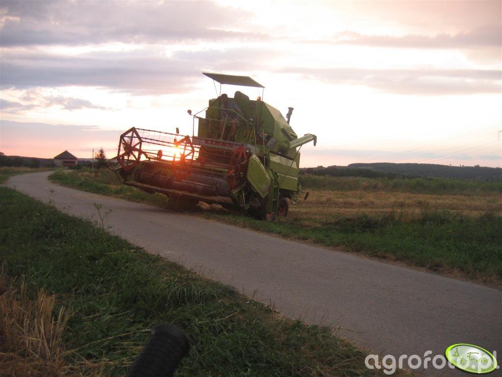 Kombajn Claas Mercator 60 podczas prac żniwnych na polu zboża. Maszyna, znana ze swojej wytrzymałości i wydajności w rolnictwie, jest wyposażona w heder z motowidłami, co umożliwia sprawne koszenie zbóż. Claas Mercator 60 posiada pojemność zbiornika wynoszącą 2 600 litrów, co pozwala na dłuższą pracę bez częstych przerw na opróżnianie ziarna. Silnik o mocy około 80 KM (59 kW) zapewnia wystarczającą siłę napędową do obsługi maszyny, zwłaszcza na większych polach. Kombajn działa na systemie omłotu z bębnem młócącym, co gwarantuje efektywne oddzielanie ziarna od słomy. W tym ujęciu maszyna znajduje się na skraju pola, gotowa do rozpoczęcia kolejnego przejazdu, z zachodzącym słońcem w tle, co dodaje malowniczego charakteru temu rolniczemu krajobrazowi.