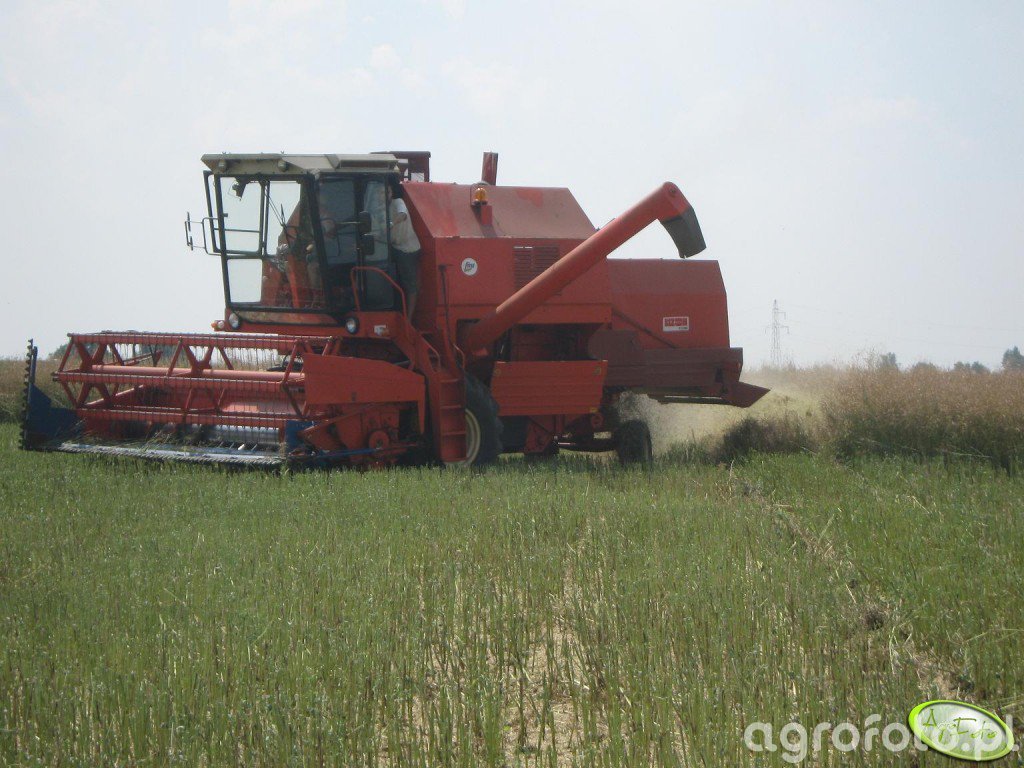 Kombajn Bizon Rekord Z058 podczas koszenia zboża na polu. Maszyna jest wyposażona w heder z motowidłami, co wskazuje na prace żniwne, najprawdopodobniej związane z pszenicą lub jęczmieniem. Bizon Rekord Z058 napędzany jest 6-cylindrowym silnikiem wysokoprężnym SW 400 o mocy 150 KM, co zapewnia efektywne zasilanie systemu omłotu. Zbiornik na ziarno o pojemności 3 340 litrów umożliwia dłuższą pracę bez potrzeby częstego opróżniania, co jest istotne podczas intensywnych dni żniwnych. Czerwony korpus maszyny z charakterystycznym logo Bizon podkreśla jej przynależność do rodziny maszyn, które przez lata zdobyły uznanie w rolnictwie. Otoczenie pola sugeruje typowe warunki pracy w sezonie żniwnym, a płaski teren ułatwia operacje maszyną.