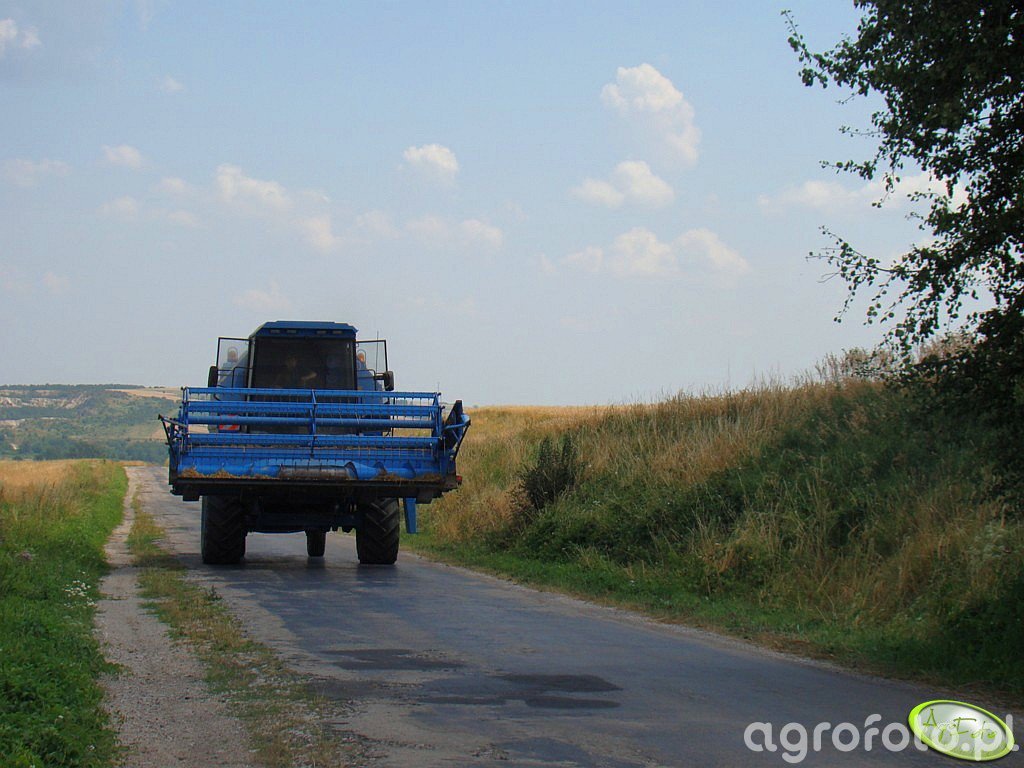 Kombajn Bizon Rekord Z058 widoczny na zdjęciu przemieszcza się po drodze dojazdowej, prawdopodobnie między polami. Maszyna ta charakteryzuje się charakterystycznym, niebieskim kolorem oraz dużą kabiną operatorską. Bizon Rekord Z058 jest wyposażony w silnik wysokoprężny SW 680/220 o mocy 220 KM, co zapewnia odpowiednią wydajność podczas intensywnych prac polowych. Model ten wykorzystuje system bębnowo-odrzutnikowy do omłotu, a pojemność zbiornika na ziarno wynosi 3000 litrów. Hedery w tej serii są różnej szerokości, dostosowane do potrzeb różnych upraw. Na obrazku widoczny jest heder z motowidłami, co wskazuje, że kombajn jest przystosowany do koszenia zbóż. Kombajn w realistycznym kontekście pracy jest częstym widokiem na polskich polach, gdzie skutecznie wspomaga zbiór w sezonie żniw.