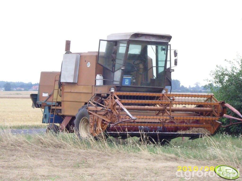 Kombajn Bizon Z056 podczas prac żniwnych na polu zboża. Maszyna ta charakteryzuje się klasyczną bryłą i typową dla tej serii kolorystyką. Wyposażony w silnik o mocy 100 KM, Bizon Z056 wykorzystuje system omłotu bębnowego, który zapewnia skuteczny omłot i separację ziarna. Zbiornik ziarna o pojemności około 3000 litrów umożliwia dłuższe etapy pracy bez potrzeby częstego opróżniania. Na zdjęciu kombajn stoi na drodze przy polu, co wskazuje na przygotowania do kolejnej fazy żniw. Heder z motowidłami doskonale nadaje się do koszenia zbóż, podkreślając wszechstronność i wydajność tej konstrukcji w typowych warunkach polowych.