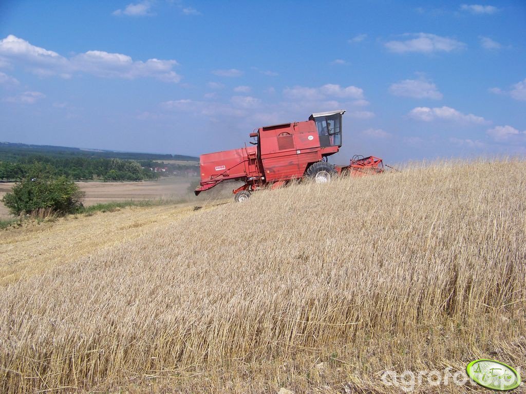 Kombajn Bizon Rekord Z058 podczas koszenia zboża na polu. Maszyna jest wyposażona w silnik o mocy około 150 KM, który zapewnia efektywne działanie podczas prac żniwnych. Bizon Rekord Z058 korzysta z hedera z motowidłami, co umożliwia precyzyjne cięcie i zbiór ziarna. Kombajn ma pojemność zbiornika wynoszącą 3000 litrów, co pozwala na dłuższą pracę bez konieczności częstego rozładunku. Na zdjęciu widoczny jest w trakcie pracy na pochyłym terenie, co podkreśla jego zdolność do działania w zróżnicowanych warunkach polowych, zapewniając optymalną wydajność i skuteczność zbiorów.
