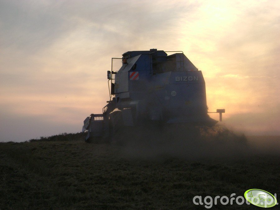 Kombajn Bizon Rekord Z058 podczas prac żniwnych na polu. Ten charakterystycznie ubarwiony w odcieniach niebieskiego kombajn wyposażony jest w heder z motowidłami, co wskazuje na koszenie zbóż. Bizon Z058 jest napędzany silnikiem o mocy 150 KM, co pozwala efektywnie zasilać jego system omłotu bębnowego. Maszyna posiada zbiornik o pojemności 3000 litrów, umożliwiający nieprzerwaną pracę podczas równomiernego koszenia. Kombajn uwieczniony w świetle zachodzącego słońca prezentuje się w pełnym działaniu, podkreślając swoją rolę w krajobrazie wiejskim.
