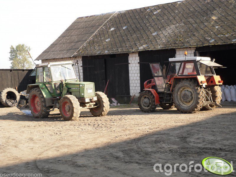 Ciągnik Fendt 611 Turbomatic pracuje na placu gospodarstwa, prezentując swoją charakterystyczną moc i wszechstronność. Wyposażony w silnik o mocy znamionowej 110 KM, zapewnia niezbędną siłę do efektywnej współpracy w różnorodnych warunkach rolniczych. Jego 6-cylindrowy silnik o pojemności skokowej 5.7 litra gwarantuje stabilność i wydajność podczas pracy, co jest kluczowe przy ciągnięciu masywniejszych maszyn. W tej sytuacji, Fendt 611 współpracuje z pługiem Niemeyer, co ukazuje jego zdolność do obsługi wymagających zadań ziemnych. Dodatkowo, jego skrzynia biegów typu Turbomatic umożliwia płynne przełączanie biegów, co sprzyja dostosowywaniu prędkości do konkretnego zadania. Z boku widoczny jest Zetor 8045, który pełni funkcję pomocniczą, dodając harmonii i efektywności do codziennych prac gospodarstwa. Całość obrazu podkreśla zaawansowanie technologiczne i niezawodność maszyn rolniczych Fendt.