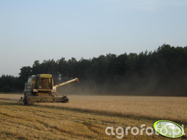 Kombajn Fortschritt E-514 podczas prac żniwnych na polu zboża. Maszyna wyposażona w heder z motowidłami skutecznie realizuje proces koszenia, dostosowując się do charakterystyki polskich pól. Fortschritt E-514 napędzany silnikiem o mocy 105 KM wykorzystuje klasyczny system omłotu bębnowego, co zapewnia solidne parametry pracy przy zachowaniu odpowiedniej jakości ziarna. Zbiornik na ziarno o pojemności 3 200 litrów umożliwia efektywne gospodarowanie materiałem podczas zbiorów. Na zdjęciu kombajn porusza się po rozległym polu zboża, w tle widoczna jest zalesiona krawędź działki, co nadaje mu realny kontekst pracy w typowym wiejskim krajobrazie.
