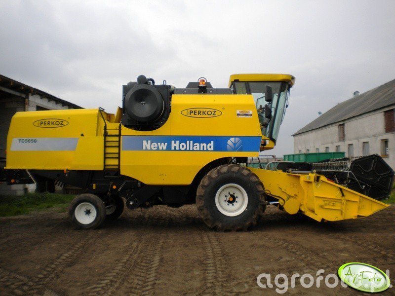 Kombajn New Holland TC 5050 na placu gospodarstwa. Jest to maszyna wyposażona w heder z motowidłami, co sugeruje jego przeznaczenie do koszenia zbóż. TC 5050 napędzany jest silnikiem o mocy około 175 KM, co zapewnia odpowiednią wydajność i efektywność podczas prac polowych. Posiada konwencjonalny system omłotu z bębnem o szerokości 1,3 m, który wspomaga przepustowość i dokładność żniw. Zbiornik na ziarno o pojemności 5200 litrów pozwala na dłuższą pracę bez konieczności częstego rozładunku, co jest istotnym atutem w kontekście żniw na dużych powierzchniach. Widoczne na zdjęciu charakterystyczne żółto-niebieskie barwy marki New Holland podkreślają profesjonalny wygląd kombajnu.