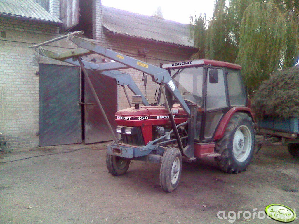 Ciągnik Escort 450 operuje z ładowaczem czołowym na placu gospodarstwa, wykorzystując swoją moc do sprawnego przemieszczania surowców. Wyposażony w silnik o mocy około 50 KM, oparty na trwałej konstrukcji czterocylindrowej, zapewnia wystarczające możliwości do obsługi codziennych zadań w średniej wielkości gospodarstwie. Escort 450, dzięki mechanicznej skrzyni biegów, precyzyjnie dopasowuje prędkość do wymagań operacyjnych, co ułatwia współpracę z przystawkami rolniczymi. Ładowacz czołowy perfekcyjnie integruje się z ciągnikiem, umożliwiając efektywne załadunki i rozładunki materiałów. Jego funkcjonalność i wydajność czynią go niezastąpionym narzędziem w codziennej pracy na farmie.