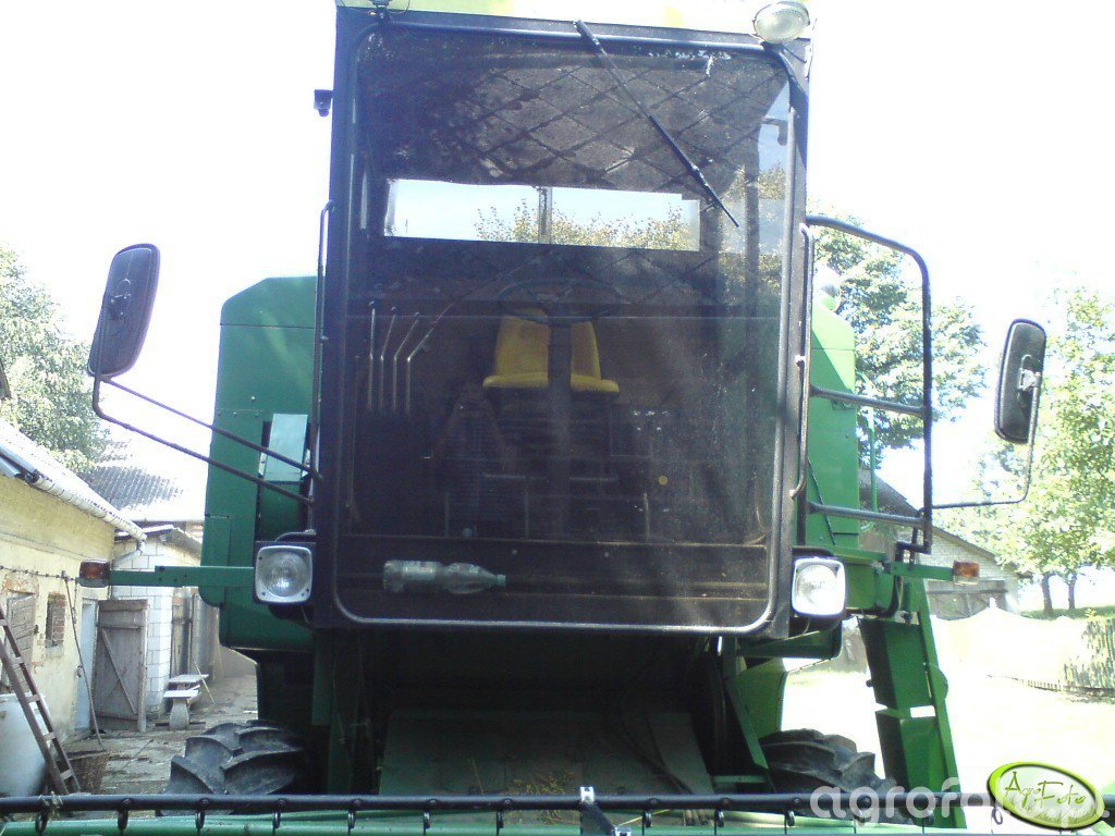 Kombajn John Deere 1042 prezentowany na zdjęciu znajduje się na placu gospodarstwa, gotowy do prac żniwnych. Charakteryzuje się zieloną kolorystyką typową dla maszyn marki John Deere, z wyeksponowaną kabiną operatora zapewniającą komfort i widoczność. Model 1042, wyposażony w heder z motowidłami, jest przystosowany do efektywnego koszenia zbóż. Kombajn napędzany jest silnikiem diesla o mocy około 120 KM, co pozwala na wydajne funkcjonowanie nawet w intensywnych warunkach pracy. Zbiornik ziarna w tym modelu ma pojemność około 4 000 litrów, co umożliwia dłuższą pracę bez konieczności częstego rozładunku. Dodatkowo, system omłotu oparty na klasycznym bębnie jest dostosowany do zachowania jakości ziarna przy zachowaniu wysokiej przepustowości. Na zdjęciu widzimy maszynę stojącą w pobliżu budynków gospodarczych, co wskazuje na przygotowania do nadchodzącego okresu zbiorów.