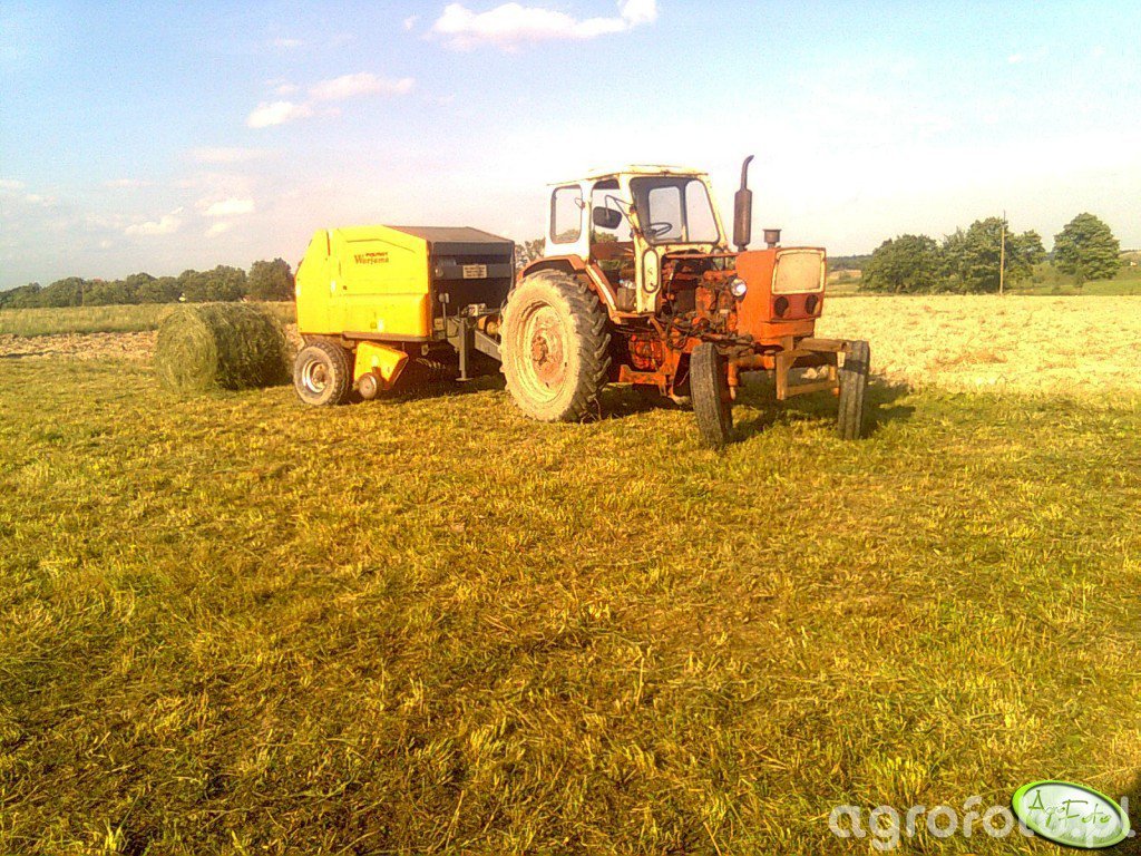 Ciągnik rolniczy Jumz efektywnie pracuje na polu, współpracując z prasą zwijającą Warfama. Jumz, znany z solidnej konstrukcji, posiada silnik o mocy około 80 KM oraz czterocylindrową jednostkę napędową z pojemnością skokową wynoszącą 4,75 litra. Maszyna jest wyposażona w mechaniczną skrzynię biegów, co umożliwia precyzyjne dostosowanie prędkości do różnorodnych warunków pracy polowej. W tym układzie moc ciągnika pozwala na efektywne prasowanie siana, co jest kluczowe dla przygotowania materiału paszowego. Warfama, jako maszyna towarzysząca, uzupełnia tę konfigurację, doskonale radząc sobie podczas zbiorów. Całość zestawu działa harmonijnie, demonstrując typowy przykład współczesnego rolnictwa zorientowanego na wydajność i efektywność.