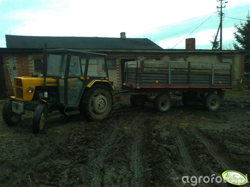 Ursus C-330 to lekki ciągnik rolniczy o mocy 30 KM, napędzany dwucylindrowym silnikiem wysokoprężnym S-312C o pojemności 1960 cm³, produkowanym w Zakładach Mechanicznych Ursus w latach 1967–1987. Prosta, niesynchronizowana skrzynia biegów 6 2 zapewnia dobrą kontrolę prędkości w lekkich pracach polowych i przy transporcie z przyczepą rolniczą, jak na widocznym placu gospodarstwa. Masa własna około 1900 kg w połączeniu z tylnym TUZ o udźwigu rzędu 800–900 kg pozwala bezpiecznie agregować lekkie maszyny uprawowe lub niewielkie ładunki w transporcie wewnątrzgospodarczym. Charakterystyczna wąska maska, prosty napęd bez przedniego mostu napędowego oraz niskie zużycie paliwa sprawiają, że Ursus C-330 pozostaje popularnym ciągnikiem pomocniczym, a jego przybliżone ceny rynkowe w Polsce wahają się obecnie najczęściej w granicach 15 000–30 000 zł w zależności od stanu technicznego i wyposażenia.