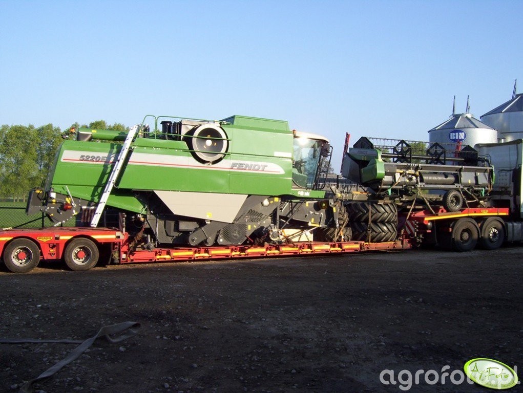 Kombajn Fendt 5220E znajduje się na ciężarówce transportowej, co wskazuje na logistyczny etap relokacji sprzętu do miejsca docelowego. Jest to model charakteryzujący się solidnym systemem omłotu, który umożliwia efektywne żniwa. Napędzany jest wysokowydajnym dieslem generującym około 218 KM, co zapewnia odpowiednią moc do pracy w polu. Maszyna wyposażona jest w heder z motowidłami, co sugeruje, że jest przeznaczona do koszenia zbóż. Posiada duży zbiornik o pojemności około 8 600 litrów, co umożliwia dłuższą pracę bez konieczności częstego rozładunku ziarna. Widoczny charakterystyczny zielony kolor korpusu oraz logo Fendt podkreślają przynależność do renomowanej serii maszyn rolniczych, cenionych za niezawodność i wydajność podczas sezonowych prac polowych.