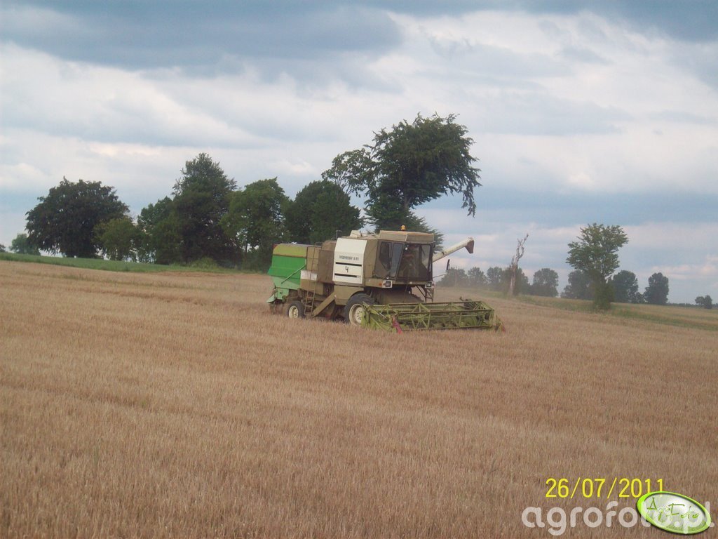 Kombajn Fortschritt E-514 podczas prac żniwnych na polu zboża. Maszyna wyposażona w heder z motowidłami jest przystosowana do efektywnego koszenia zbóż. Ten model napędzany jest sześciocylindrowym silnikiem Diesla o mocy 105 KM, co zapewnia wystarczającą moc do pracy na średnich i dużych gospodarstwach rolnych. Fortschritt E-514 posiada system omłotu bębnowo-klawiszowego, który umożliwia wydajne oddzielanie ziarna od słomy. Zbiornik ziarna o pojemności około 4 200 litrów umożliwia długą pracę bez częstego opróżniania, co jest znaczące dla operacji na dużych polach. Kombajn widoczny jest w typowym dla tego modelu jasnozielonym i kremowym malowaniu, charakterystycznym dla serii Fortschritt, w otoczeniu spokojnego krajobrazu rolniczego.