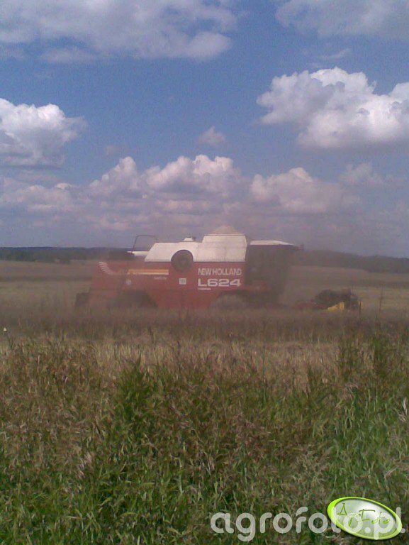 Kombajn New Holland L624 podczas żniw na polu zboża. Maszyna charakteryzuje się konstrukcją dostosowaną do intensywnych prac polowych, co można zauważyć na przykładzie hedera z motowidłami, przeznaczonego do zbioru zbóż. Napędzana silnikiem wysokoprężnym o mocy około 200 KM, maszyna ta oferuje wydajny omłot oraz skuteczny transport ziarna do zbiornika. Pojemność zbiornika wynosi około 5500 litrów, co pozwala na dłuższą pracę bez konieczności częstego opróżniania. Obecność kombajnu na polu wskazuje na typową pracę żniwną w otoczeniu typowego krajobrazu rolniczego, gdzie zboże jest koszone i przetwarzane na surowiec gotowy do dalszego transportu i przechowywania.