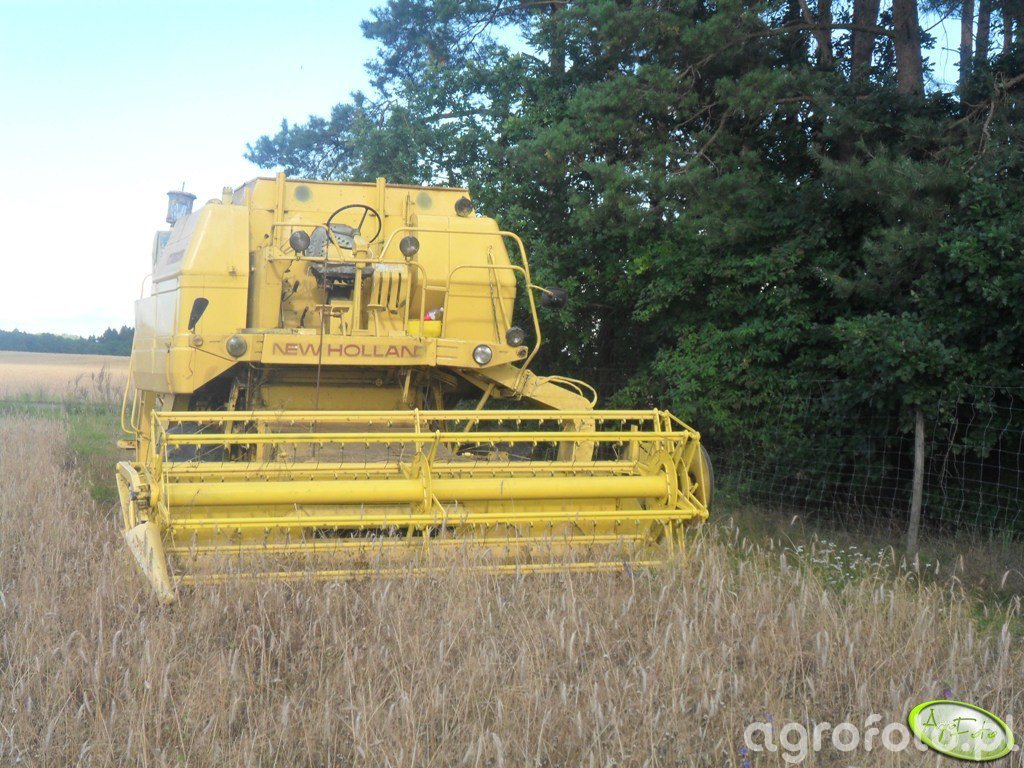 Kombajn New Holland S-1550 podczas pracy żniwnej na polu zboża. Maszyna ta, charakterystyczna dzięki swojemu jaskrawożółtemu kolorowi oraz widocznemu logo producenta, jest wyposażona w heder z motowidłami, co wskazuje na jej zdolność do efektywnego koszenia zbóż. Kombajn ten zasilany jest 120-konnym silnikiem o wysokiej wydajności, który zapewnia odpowiednią moc do napędu systemu omłotu konwencjonalnego. Posiada zbiornik o pojemności około 3000 litrów, co pozwala na dłuższe prace bez częstego przerywania w celu opróżniania. Na zdjęciu widoczny jest kontekst pracy maszyny w otoczeniu przyrody, gdzie pole zboża sąsiaduje z linią drzew, tworząc typowy krajobraz polski.