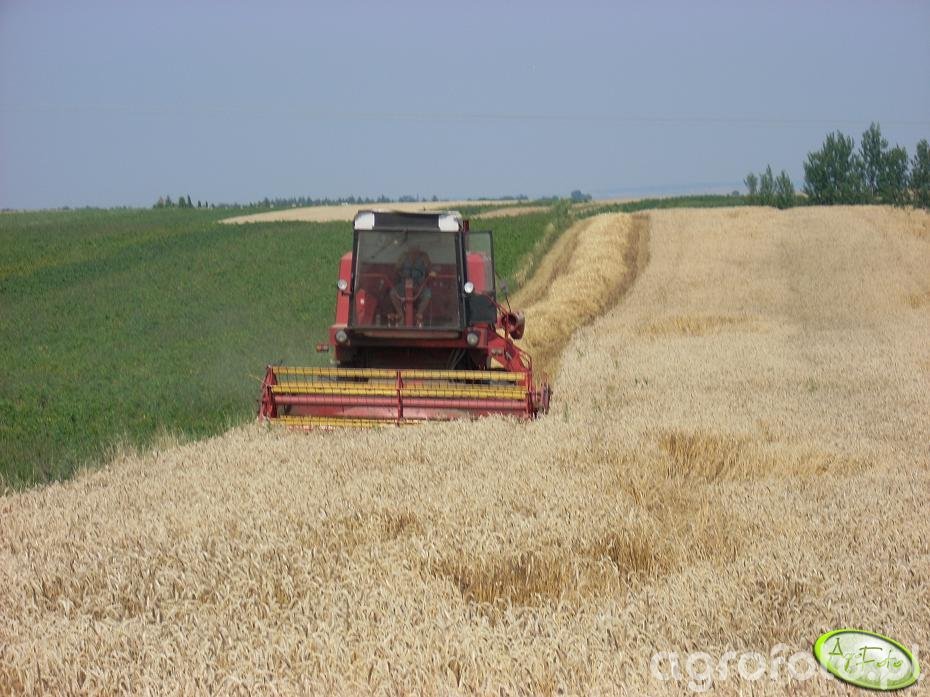 Kombajn Bizon Super Z056 podczas koszenia zbóż na polu. Maszyna ta, napędzana silnikiem SW400 o mocy około 100 KM, jest wyposażona w bębnowy system omłotu, co pozwala na efektywne żniwa na różnorodnych rodzajach zbóż. Zbiornik ziarna ma pojemność około 2 540 litrów, co sprawia, że kombajn może pracować przez dłuższy czas bez konieczności częstego rozładunku. Heder z motowidłami o szerokości roboczej wynoszącej 4,2 metra umożliwia dokładne koszenie i zbieranie ziarna. Kombajn funkcjonuje na polu żniwnym, zapewniając skuteczność i wydajność w zbiorze w dogodnych warunkach pogodowych i agrarnych.