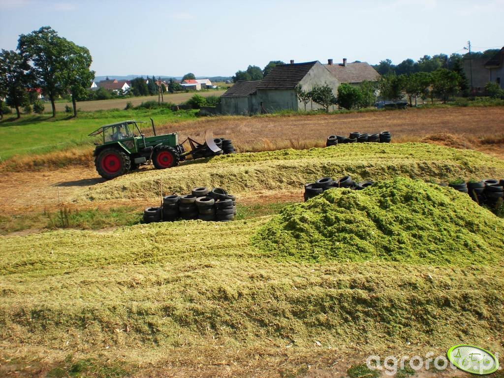 Ciągnik Fendt Favorit 611 LS pracuje na polu, prezentując swoją niezawodność podczas zbioru na pryzmę. Wyposażony w silnik MWM o mocy znamionowej 110 KM i pojemności skokowej 5.7 litra, ten model oferuje solidne osiągi w trudnych warunkach polowych. Skrzynia biegów mechaniczna 12/4 umożliwia precyzyjne dostosowanie przełożeń do wymagań terenu, co jest kluczowe podczas współpracy z maszyną do zbioru karmy. Potężny ciągnik, dzięki swoim parametrom technicznym, skutecznie radzi sobie z transportem ciężkich ładunków, zachowując jednocześnie stabilność i kontrolę nawet na nierównym terenie. W pracy z siewnikiem lub rozrzutnikiem wyróżnia się efektywnością, co wpływa na optymalizację działań w gospodarstwie rolnym.