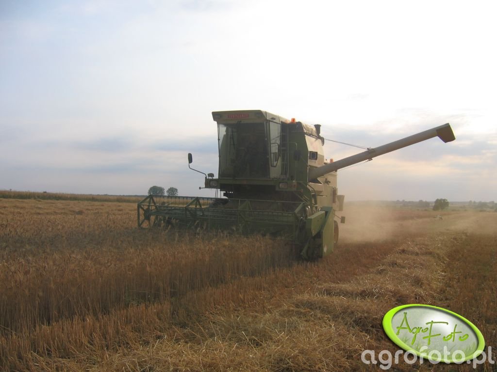 Kombajn Fortschritt E-514 podczas żniw na polu zboża. Maszyna wyposażona jest w heder z motowidłami, co umożliwia efektywne koszenie różnorodnych zbóż. Model E-514 charakteryzuje się silnikiem IFA o mocy około 105 KM, co pozwala na wydajną pracę, nawet na większych areałach. System omłotu w tym kombajnie oparty jest na klasycznym bębnie z klepiskiem, co zapewnia skuteczne oddzielanie ziarna od reszty roślin. Zbiornik na ziarno o pojemności 3000 litrów pozwala na dłuższą pracę bez potrzeby częstego opróżniania. Widoczny na zdjęciu charakter pracy i rozległe pole wskazują na intensywne wykorzystanie maszyny w sezonie żniwnym.
