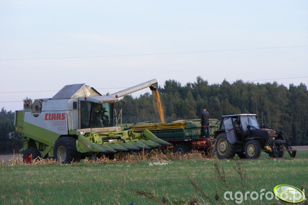 Kombajn Claas Lexion 430 podczas prac żniwnych na polu. Widoczny na zdjęciu model jest wyposażony w heder z motowidłami, co wskazuje na koszenie zbóż. Maszyna rozładowuje ziarno do przyczepy, obsługiwanej przez ciągnik stojący obok. Claas Lexion 430 charakteryzuje się silnikiem Mercedes-Benz o mocy około 260 KM, co zapewnia wydajność i efektywność podczas pracy. Zbiornik ziarna o pojemności 8 600 litrów umożliwia długie godziny nieprzerwanego koszenia, a system APS zwiększa przepustowość omłotu o około 20% w porównaniu do standardowych rozwiązań. Kombajn pracuje w otoczeniu pola, a w tle widoczne są drzewa, co sugeruje obecność niewielkiego zagajnika.