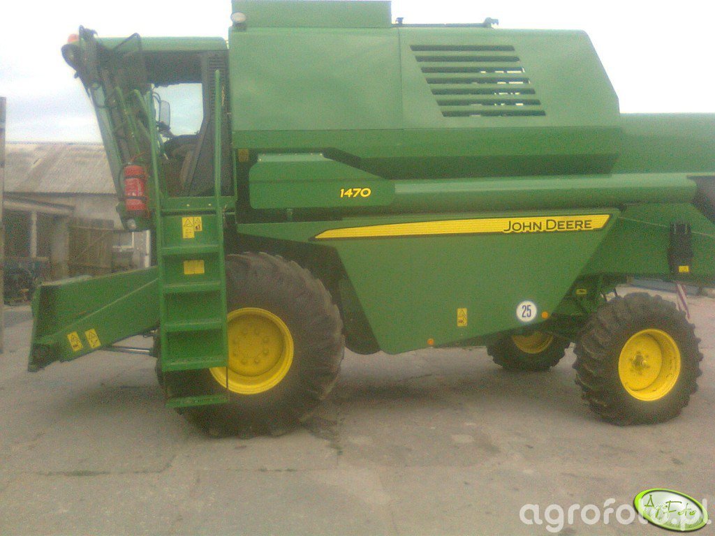 Kombajn John Deere 1470 podczas postoju na placu gospodarstwa. Maszyna ta charakteryzuje się niezawodnym silnikiem o mocy około 250 KM, co zapewnia odpowiednią wydajność podczas żniw. Wyposażony w konwencjonalny bębenowy system omłotu, kombajn John Deere 1470 jest zaprojektowany do efektywnego zbioru ziaren. Zbiornik na ziarno ma pojemność około 8 000 litrów, co umożliwia dłuższą pracę bez częstego rozładunku. Na zdjęciu widoczny jest charakterystyczny zielono-żółty kolor maszyny, co dodatkowo podkreśla rozpoznawalną markę John Deere. Kombajn jest w stanie postoju, prawdopodobnie przygotowywany do następnych prac polowych.