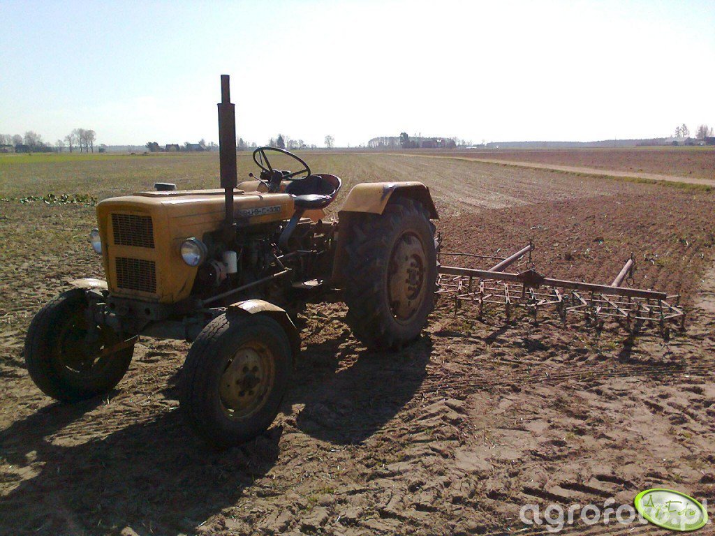 Ursus C-330 podczas pracy polowej z zawieszaną broną wirnikową wykorzystuje swoją prostą, ale solidną konstrukcję do uprawy roli w lekkich i średnich glebach. Ciągnik napędzany jest 2-cylindrowym silnikiem wysokoprężnym S-312C o pojemności 1960 cm³ i mocy około 30 KM, współpracującym z niesynchronizowaną skrzynią biegów 6 2, co pozwala dobrać odpowiednią prędkość roboczą do bronowania. Masa własna Ursusa C-330 wynosi około 1900 kg, a udźwig tylnego TUZ sięga około 1200 kg, dzięki czemu bez problemu obsługuje lekką bronę wirnikową używaną do doprawienia roli przed siewem lub wyrównania pola po orce. Model ten był produkowany w latach 1967–1987 i do dziś pozostaje popularnym, ekonomicznym ciągnikiem pomocniczym w małych i średnich gospodarstwach, a przybliżone ceny zadbanych egzemplarzy na rynku wtórnym w Polsce mieszczą się zazwyczaj w przedziale 18–30 tys. zł.