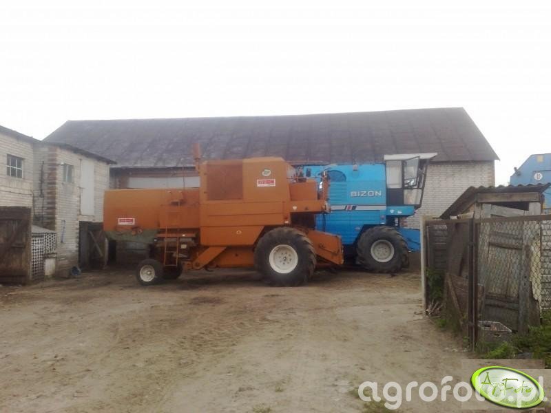 Kombajny Bizon Z056 i Z058 są widoczne na placu gospodarstwa, gotowe do żniw. Model Z056 wyróżnia się niebieską kolorystyką i jest znany z zastosowania silnika o mocy około 100 kW, co pozwala na efektywne koszenie zbóż dzięki hederowi z motowidłami. Obok stoi model Z058, który również wyposażony jest w bębenowy system omłotu, a jego charakterystyczna czerwona konstrukcja podkreśla polskie pochodzenie marki Bizon. Oba kombajny mają zbiorniki na ziarno o pojemności około 3000 litrów, co jest typowe dla maszyn tego typu, umożliwiając nieprzerwaną pracę w trakcie intensywnych żniw. Kombajny są zaparkowane w gospodarstwie, co wskazuje na przerwę pomiędzy pracami polowymi.